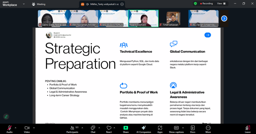 Dalam kesempatan kali ini, Rivalni Septiadi, S.Kel. menyampaikan materi mengenai peluang berkarir di luar negeri bagi mahasiswa, khususnya di bidang teknologi dan sains data. Beliau menjelaskan bahwa Data Science merupakan profesi yang bersifat global atau borderless, sehingga memungkinkan seseorang untuk bekerja di berbagai negara maupun bekerja secara jarak jauh (remote work) untuk perusahaan internasional. Disebutkan bahwa saat ini banyak negara mengalami kekurangan talenta di bidang data dan teknologi, seperti Jerman, Finlandia, Australia, dan Singapura, sehingga membuka peluang besar bagi para profesional di bidang tersebut. Selain itu, dijelaskan pula beberapa jalur karir global yang dapat ditempuh oleh lulusan di bidang data, di antaranya melalui direct hire sebagai lulusan baru di perusahaan luar negeri, bekerja terlebih dahulu di dalam negeri untuk membangun pengalaman sebelum melamar ke luar negeri, serta bekerja secara remote untuk perusahaan internasional tanpa harus berpindah negara.