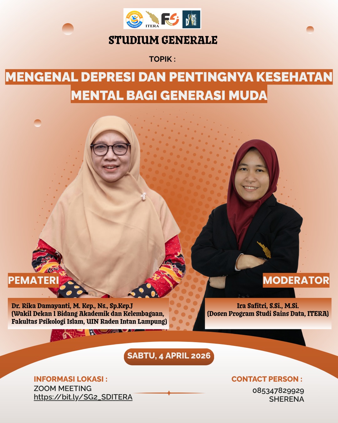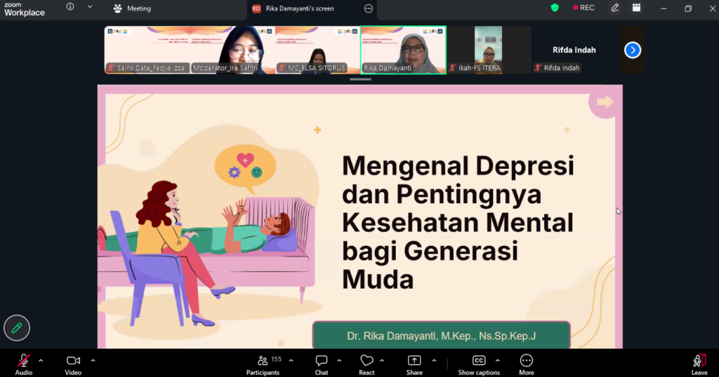 Kegiatan ini dilaksanakan pada Sabtu, 4 April 2026 secara daring melalui Zoom Meeting dengan menghadirkan narasumber Dr. Rika Damayanti, M. Kep., Ns., Sp.Kep.J., sebagai Wakil Dekan I Bidang Akademik dan Kelembagaan Fakultas Psikologi Islam UIN Raden Intan Lampung. Pada pembukaan kegiatan Studium Generale ini, disampaikan kata sambutan dari Dekan Fakultas Sains Institut Teknologi Sumatera, Dr. Ikah Ning Prasetiowati Permanasari, S.Si., M.Si. Beliau menyampaikan bahwa tema kesehatan mental sangat relevan bagi generasi muda di era digital saat ini. Menurut beliau, perkembangan teknologi membawa banyak kemudahan, namun juga menghadirkan tantangan yang dapat memengaruhi kondisi psikologis mahasiswa. Oleh karena itu, melalui Studium Generale yang mengusung tema “Mengenal Depresi dan Pentingnya Kesehatan Mental bagi Generasi Muda”, diharapkan mahasiswa dapat meningkatkan pemahaman serta kesadaran terhadap pentingnya menjaga kesehatan mental.
